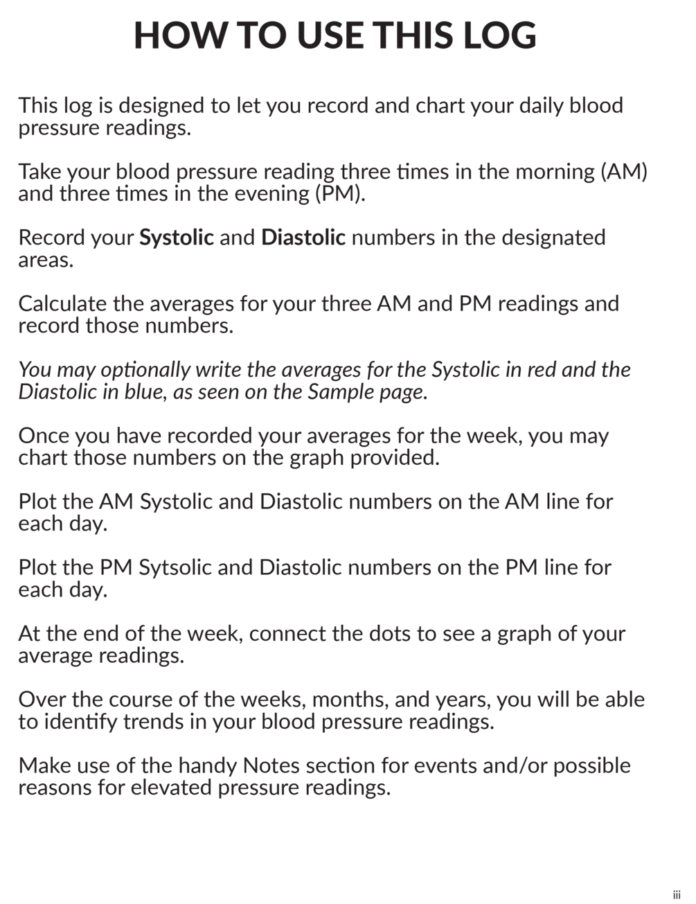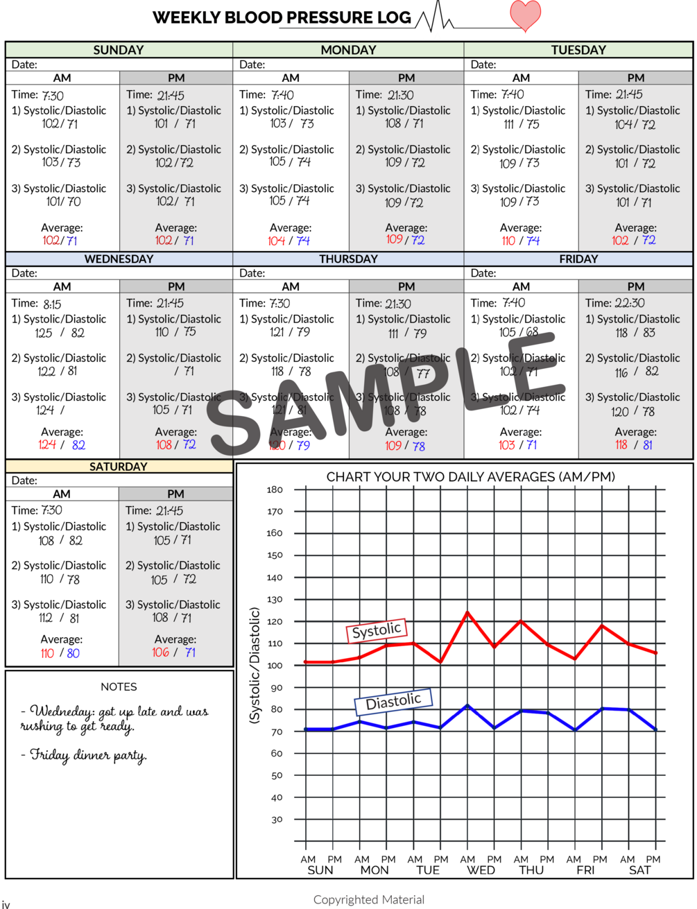 Printable weekly blood pressure log sheet (sample provided) and instructions for use.