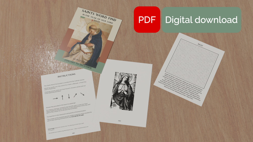 Saints Word Word Find is quick and fun word search puzzle booklet available to download and print. Makes a great activity for Catholic classrooms, homeschoolers, and parish catechetical lessons. You'll receive one puzzle for every month along with instructions and an answer key. 18 pages in total.