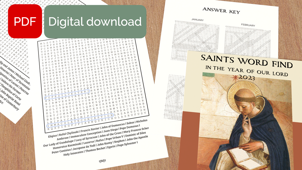 Printable digital download! For the year 2023, Catholic saints word search puzzle. One puzzle for every month, January to December. PDF format. Comes with an answer key.